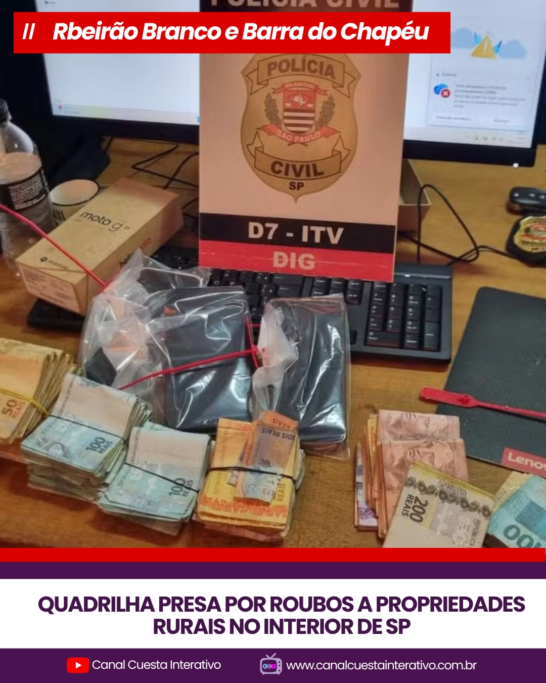 A Polícia Civil de Itapeva prendeu, na manhã desta segunda-feira (10), uma quadrilha suspeita de integrar uma organização criminosa responsável por uma série de roubos violentos em propriedades rurais nas cidades de Ribeirão Branco e Barra do Chapéu (SP).