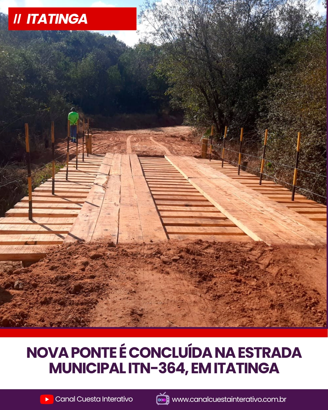 A Prefeitura de Itatinga concluiu, em parceria com a empresa Eucatex, a construção de uma nova ponte na estrada municipal ITN-364, próxima à ponte de cimento, no sentido Tapioca. A estrutura atende também as regiões da Fazenda Sonho Meu e Monte Belo, área utilizada por moradores, produtores rurais e ônibus escolares que transportam alunos da zona rural.